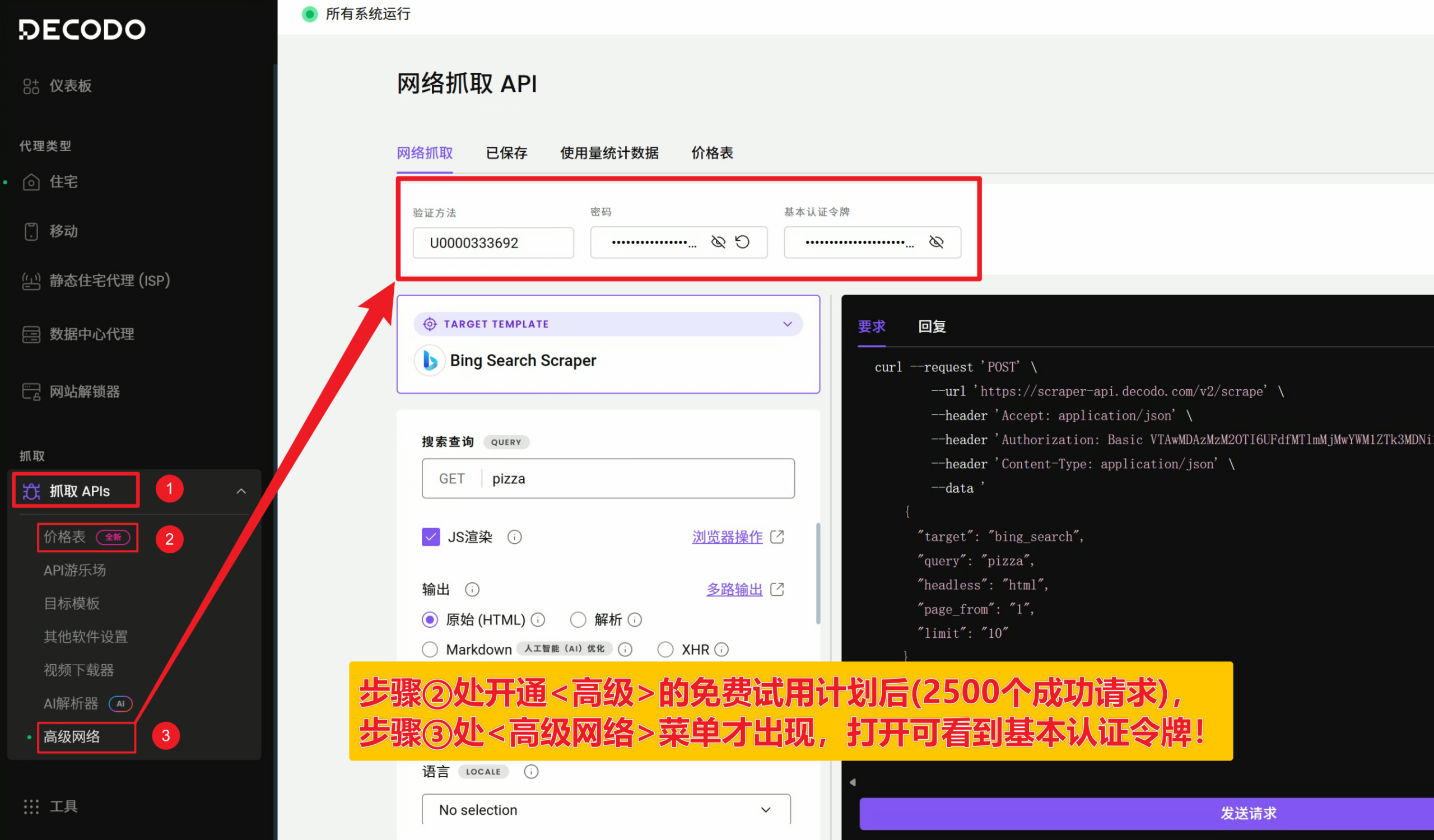 DECODO海外代理服务商除了提供住宅类型隧道代理之外,同时支持网页抓取API,必应高级查询功能使用此API可解决查询不准确、验证码等问题。