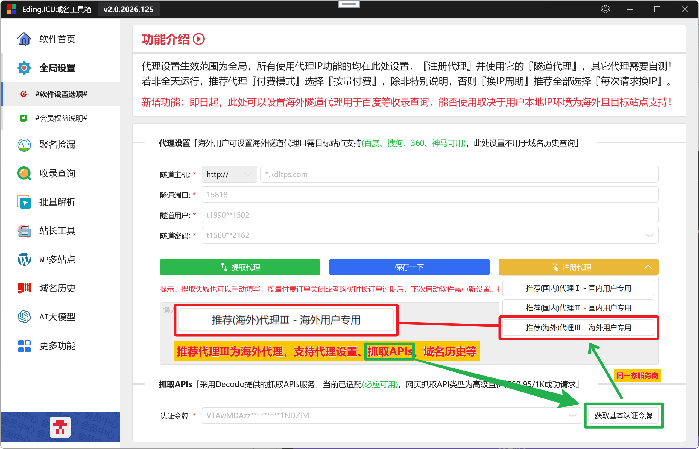 如上图,第三个推荐(海外)代理Ⅲ作为海外代理即支持全局处的代理设置(百度、搜狗、360、神马等收录查询功能),也同时支持抓取APIs(必应高级查询等收录查询功能)、域名历史栏目的域名历史查询使用。