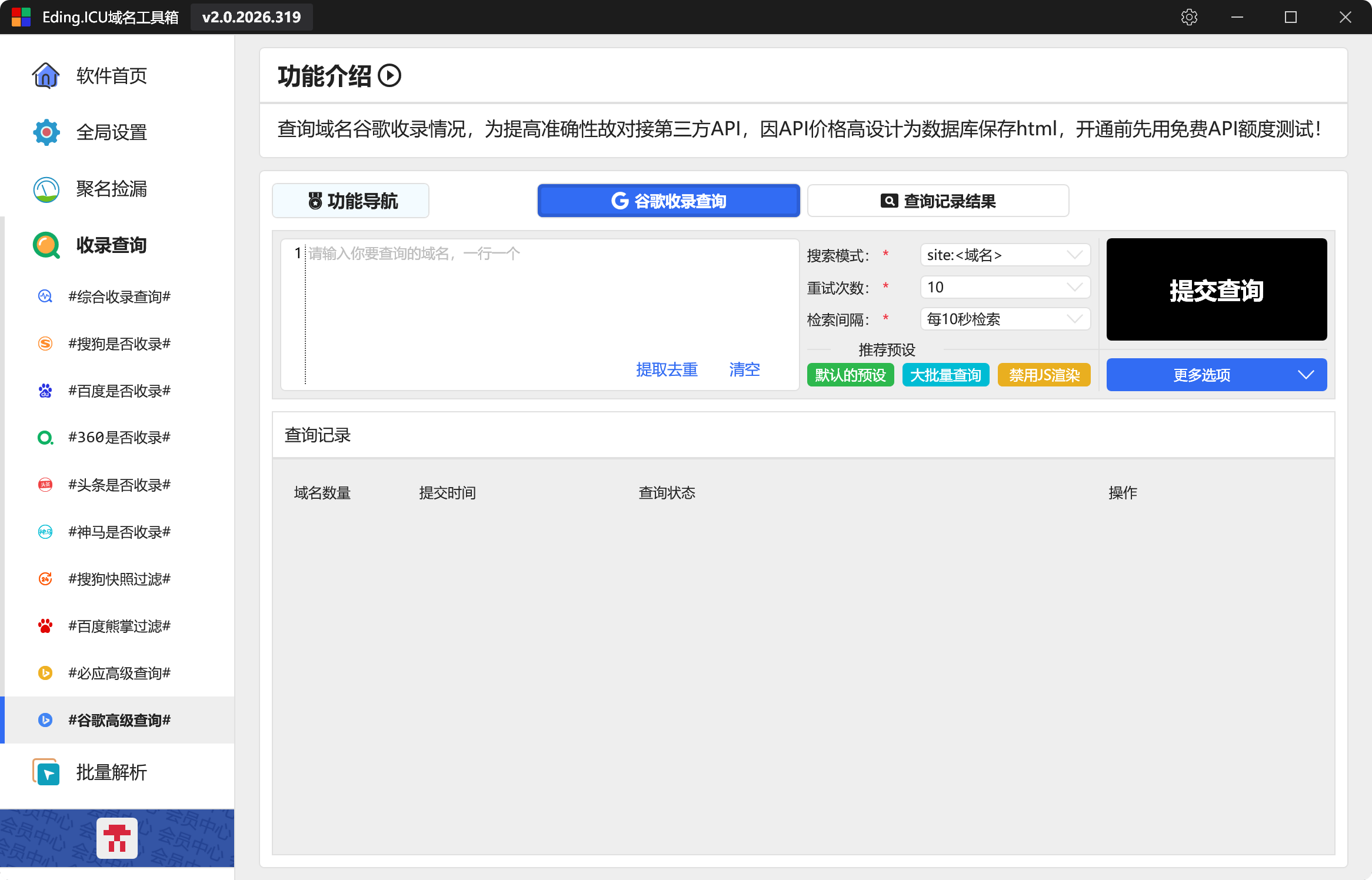 Eding.ICU域名工具箱最新版已经支持谷歌收录查询,功能位于收录查询栏目谷歌高级查询。
