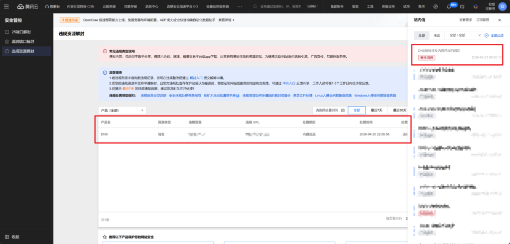 然后,腾讯的DNS云解析给我来个通知,说我某个域名有违规信息。